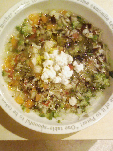 ささみ7g 納豆3.5g キャベツ5g きゅうり5g 大根6g ブロッコリ5g なす6g 人参4.5g プチトマト13g マッシュ茸5g 椎茸5g さつま芋8g 昆布0.3g 亜麻仁油1g 湯100cc カッテージ3g 小岩井20g ebi bio2g Vc0.2g Ca0.15g Zn1/10