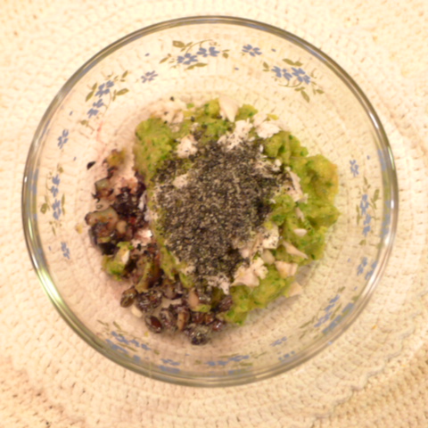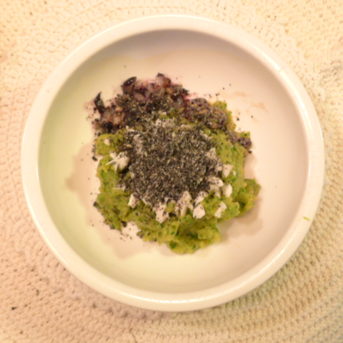 【夕ご飯】あじ(石川)8g 芋18g 南瓜7.5g トマト22g 春きゃべつ5g ブロッコリ5g 小松菜5g スナップえんどう5g 黒ごま1.5g ブルーベリー5g 黒豆納豆3.5g ebi1T bio1.5g EsC0.5g Cilantro1g 俊粉1g 湯40g