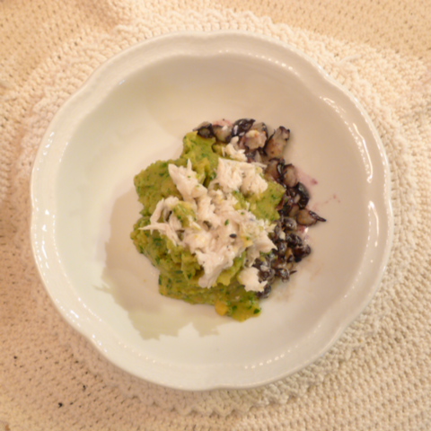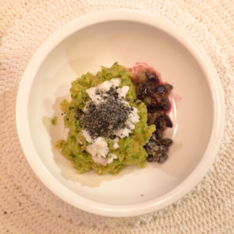 【夕ご飯】ぶり(愛媛養殖)8g 芋15g 南瓜12g トマト27g 春きゃべつ5g ブロッコリ5g 小松菜5g スナップえんどう5g 亜麻仁油0.3g ブルーベリー5g 黒豆納豆3g 俊粉1g ebi2T bio1.5g EsC0.5g Cilantro1g 湯50g