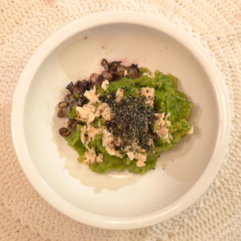 【夕ご飯】本鱒(北海道)8g 坂出金時16g 南瓜12g トマト30g 春きゃべつ5g 小松菜5g ほうれん草5g スナップえんどう5g 黒ごま1.5g 亜麻仁油0.2g ebi1.5T bio1.5g Es-C0.4g ブルーベリー5g 黒豆納豆3g 俊粉1g 湯60g
