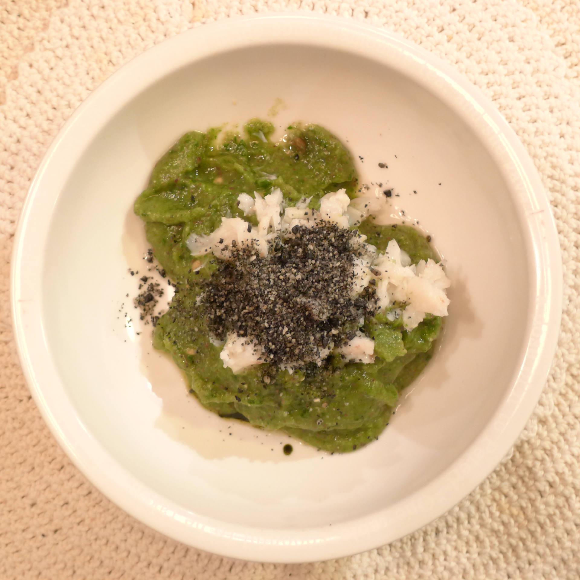 【夕ご飯】あじ(長崎)8.5g 芋15g 南瓜(鹿児島)13g トマト32g きゃべつ5g ブロッコリ6g 小松菜(長崎)5g 寒縮ほうれん草6g 黒ごま1.8g 亜麻仁油0.3g ebi2T bio1.5g PlmC0.5g Ca0.2g ブルーベリー8g 黒豆納豆3.5g 黒千石きな粉1g 湯60g