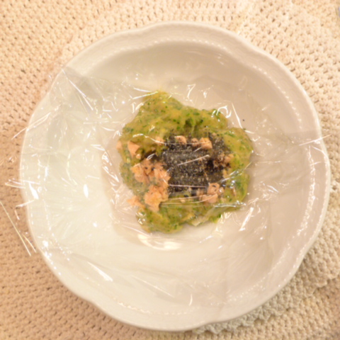 【夕ご飯】サーモン(アトランティク)4.5g 野菜の半分量35g((安納芋15g 南瓜12g トマト35g きゃべつ6g ブロッコリ6g 小松菜6g おくら6g 黒ごま2g )×1/2)ebi1T bio0.75g EsterC0.2g 六条麦茶40g