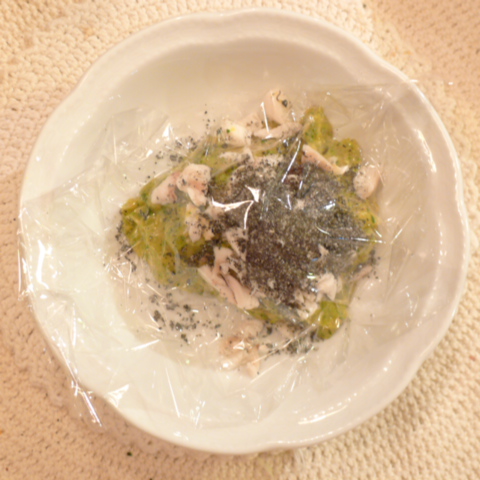 丸鯵(長崎)8.5g 芋15g 南瓜15g 舞茸5g トマト35g きゃべつ7g ブロッコリ7g 小松菜5g おくら6g 黒ごま1.8g 亜麻仁油0.4g ebi1T bio1.5g EsterC0.4g cilantro0.8g ブルーベリー8g 黒豆納豆3.5g 六条麦茶85g