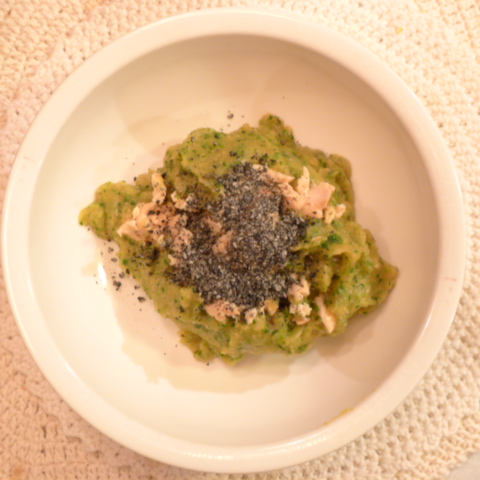 【夕ご飯】秋鮭(北海道)8.5g 芋15g 南瓜12g トマト35g きゃべつ5g ブロッコリ6g 小松菜6g おくら5g 舞茸5g 黒ごま1.5g ebi1T bio1g EsterC0.4g 黒豆納豆3.5g ブルーベリー7g 六条麦茶90g