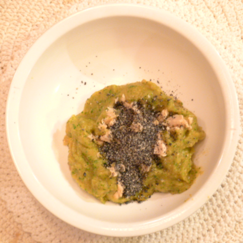 【夕ご飯】秋鮭(北海道)8.4g 芋15g 南瓜12g トマト35g きゃべつ6g ブロッコリ6g 小松菜5g おくら5g 舞茸5g もやし5g 黒ごま1.5g 黒豆納豆3.5g ブルーベリー7g 湯80g ebi1T bio1g EsterC0.4g