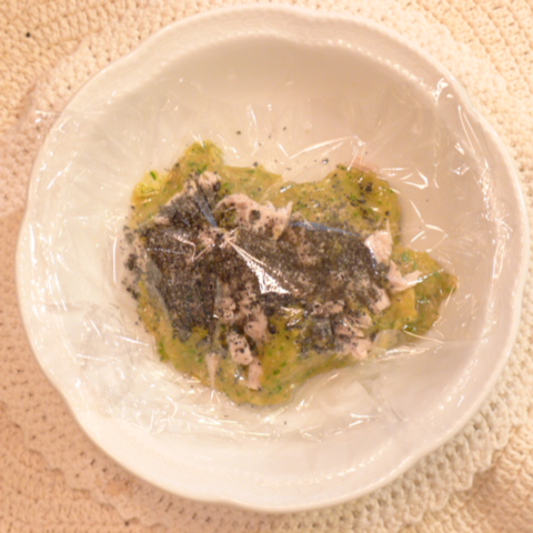 【夕ご飯】さわら(福岡)8g 芋15g 南瓜12g トマト35g きゃべつ5g ブロッコリ6g 小松菜5g おくら5g 舞茸5g 亜麻仁油0.7g 黒ごま1g 雪誉納豆3g ブルーベリー5g 六条麦茶70g ebi1T bio1g EsterC0.4g