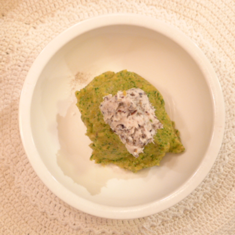 半熟卵(卵白10g 卵黄3g) 黒豆納豆2.5g 芋15g 南瓜12g トマト30g きゃべつ5g ブロッコリ5g 小松菜5g おくら5g ebi2T bio1.5g EsterC0.25g Cilantro1g 黒ごま1g 俊粉1g 湯50g