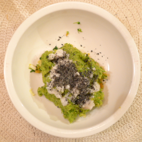 【夕ご飯】白鮭(北海道)8g 芋15g 南瓜10g きゃべつ5g ブロッコリ5g 小松菜5g おくら5g 舞茸5g 黒ごま2g 亜麻仁油0.2g ebi1T bio1g plmC0.4g Ca0.2g 六条麦茶30cc