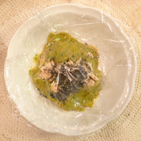 白鮭(北海道)8g 芋15g 南瓜12g トマト35g きゃべつ6g ブロッコリ芽3.5g おくら5g 舞茸5g 黒ごま0.5g 亜麻仁油0.5g ebi1T bio1g plmC0.5g Ca0.2g 雪誉納豆3.5g ブルーベリー5.7g 六条麦茶70cc