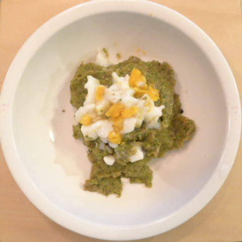 【夕ご飯】さわら(長崎)7g 芋12g きゃべつ5g ブロッコリ5g 小松菜5g 南瓜12g トマト(北海道)31g 舞茸5g 黒ごま2g 湯50cc bi1T bio1g EsC0.3g Cilantro1cc Zn1/8T 湯40cc