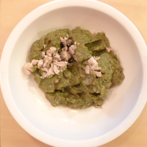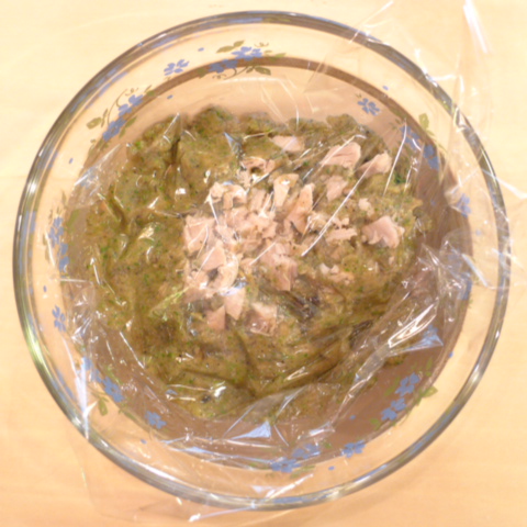 【夕ご飯】びん長まぐろ7g 芋12g 南瓜12g きゅうり(なな産)5g きゃべつ5g ブロッコリ5g 小松菜5g 舞茸出汁5g トマト(北海道)30g 黒ごま2g ebi1T bio1g EsC0.3g Cilantro1cc 湯20cc