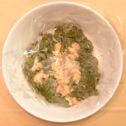 時鮭(北海道)7g 雪誉納豆3g 鳴門金時11g きゃべつ5g ブロッコリ5g 小松菜5g 南瓜11gトマト22g 黒ごま2.5g ブルーベリー5g ebi1T bio1g EsC0.3g cilantro1cc Zn1/8T 湯80cc