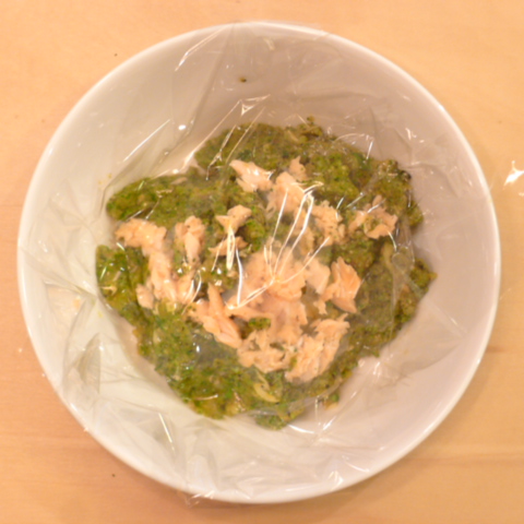 時鮭(北海道天然)7g 雪誉納豆2.5g 鳴門金時11g 香菜1g 春きゃべつ6g ブロッコリ5g 小松菜5g 南瓜11gトマト25g 黒ごま2g ブルーベリー10g ebi1T bio1g EsC0.3g Zn1/8T 湯90c