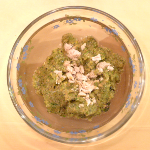 銀鮭(鳥取養殖)7g 安納芋10g 香菜1.5g 春きゃべつ5g ブロッコリ7g 小松菜5g 舞茸5g 南瓜11gトマト20g 黒ごま2g りんご25g ebi1T bio1g EsC0.3g Zn1/8T湯50cc