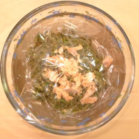 銀鮭(島根養殖)7g 黒豆納豆3g 芋12g 春きゃべつ6g ブロッコリ芽5g 舞茸5g 南瓜11gトマト26g 黒ごま2g ブルーベリー10g ebi1T bio1g EsC0.3g cilantro1cc Zn1/8T 湯90cc