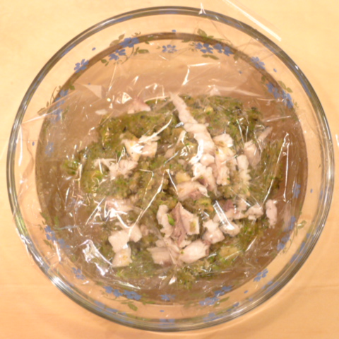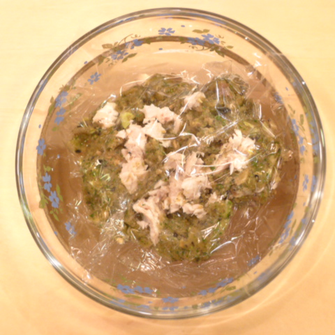ぶり(長崎)7g 雪誉納豆3g 芋11g 春きゃべつ7g ブロッコリ8g 小松菜5g 舞茸5g 南瓜11gトマト20g 黒ごま3g ブルーベリー5g ebi1T bio1g EsC0.3g cilantro1cc Zn1/8T 湯80cc