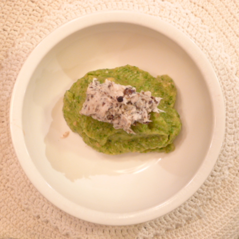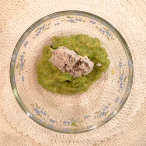 【夕ご飯】ささみ9.5g 黒豆納豆2.5g 芋16g 南瓜11g トマト30g きゃべつ5g ブロッコリ5g 小松菜5g 青アスパラ10g ebi2T Cilantro1g 俊粉1g 湯50g