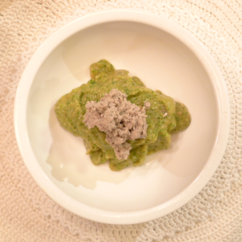 ぶり(山口天然)8.5g 黒豆納豆2.5g 芋15g 南瓜12g トマト30g きゃべつ5g ブロッコリ6g 小松菜5g 青アスパラ5g ebi2T bio2g Cilantro1g 俊粉1g 黒ごま1g 黒ごま1.5g 小岩井3g 湯100g
