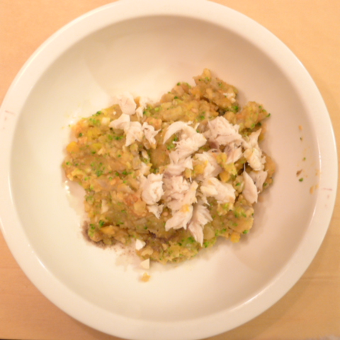 さわら7g(愛媛) 芋11g きゃべつ5g ブロッコリ5g 南瓜8g 舞茸5g トマト25g 白ごま1.5g ebi1T bio1g EsC0.3g Zn1/8T 納豆3.5 ブルーベリー5g 湯100cc