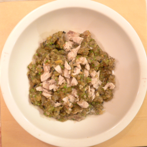 さわら(長崎)7g 納豆3g 安納芋10g きゃべつ5g ブロッコリ6g 南瓜9g 舞茸6g トマト33g 黒ごま1.5g ebi1T bio1g EsC0.3g Zn1/8T 小岩井10g 湯80cc