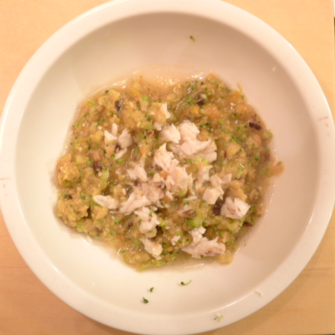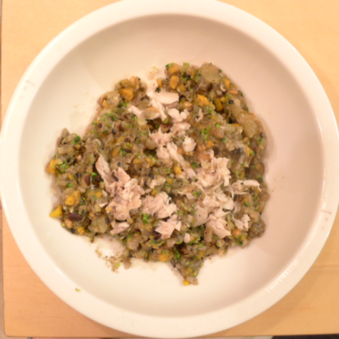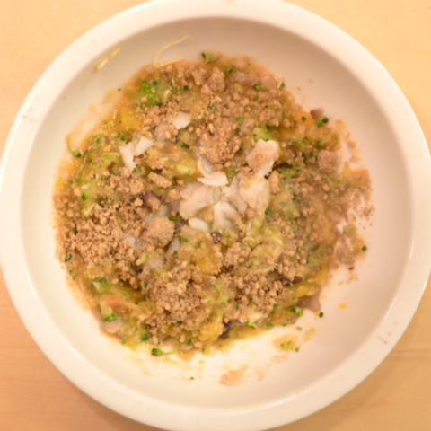 ぶり(長崎)7.5g 黒豆納豆2.5g 芋10g きゃべつ5g ブロッコリ5g 南瓜(沖縄)7g 舞茸出汁3.5g トマト20g ebi1T bio2/3g EsC0.3g Zn1/8T小岩井15g 湯80cc