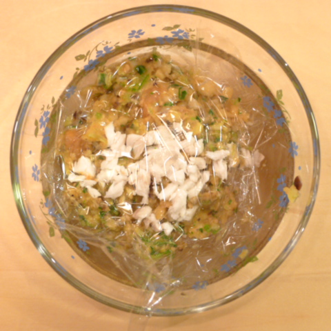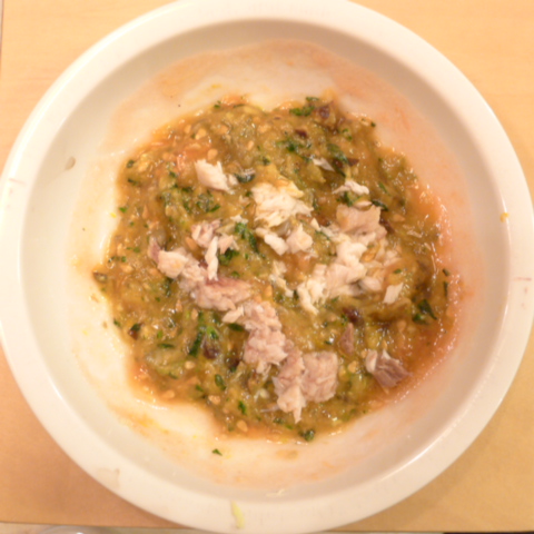 ぶり(長崎)7g 黒豆納豆2g 芋10g きゃべつ5g 菊菜(柳澤家産)3.5g 南瓜(沖縄)8g 舞茸出汁10g トマト25g ebi1T bio2/3g EsC0.3g Zn1/8T小岩井10g 湯80cc