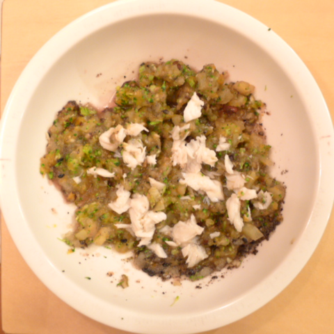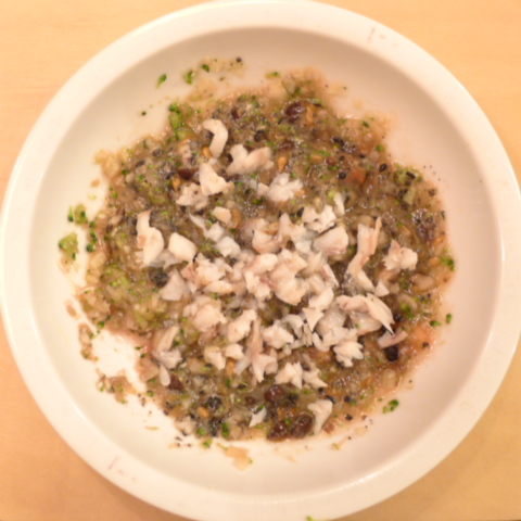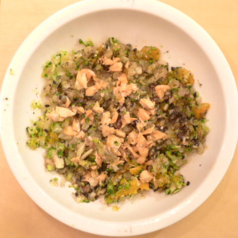 【夕ご飯】鰆(長崎)7g 黒豆納豆3g 鳴門金時10g きゃべつ5g ブロッコリ5.5g りんご20g 黒ごま1.5g 昆布0.2g 石榴5g ebi1T bio2/3g EsC0.3g VC0.05g Zn1/8T小岩井10g 湯100cc