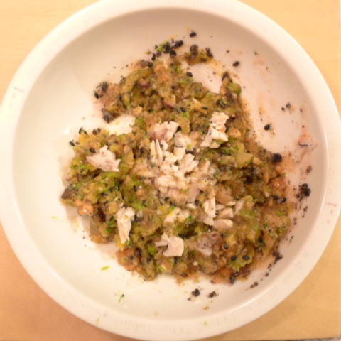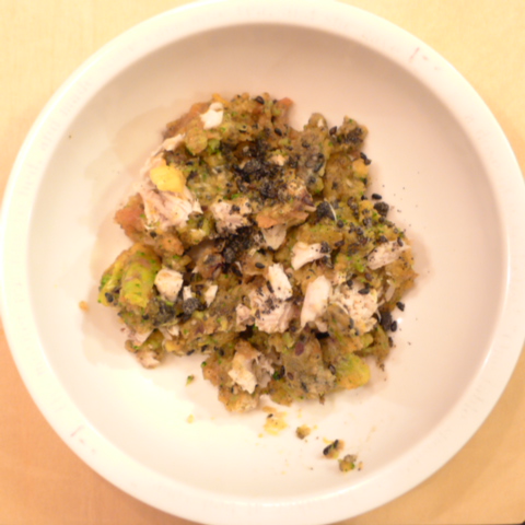 さわら(山口)7g 黒豆3g 安納芋10g きゃべつ5g ブロッコリ5.5g 南瓜(北海道)8g りんご25g 黒ごま1.5g ebi1T bio1g esterC0.3g Zn1/8T 小岩井10g 湯60cc