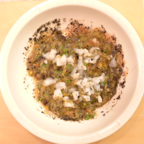 かんぱち(鹿児島)7g 黒豆納豆3g 紅東10g キャベツ5g ブロッコリ芽3.5g 南瓜(佐賀)6.5g トマト20g 黒ごま1.5g ebi1T bio1g EsterC0.2g Zn1/8T 小岩井10g 湯110cc
