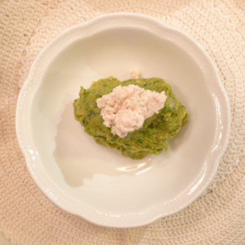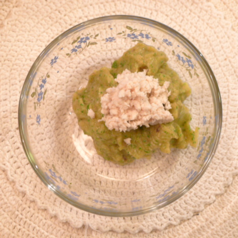 ささみ8.5g 芋16g 南瓜12g トマト27g きゃべつ5g ブロッコリ5g 小松菜5g おくら5g 青アスパラ10g 白アスパラ5g ebi2T bio1.5g Cilantro1g 小岩井3g 俊粉1g 黒ごま1g 湯90g