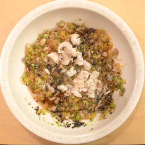 ぶり(北海道天然)8g 豆腐 15 安納芋11 キャベツ5 ブロッコリ5 南瓜5 りんご30 亜麻仁油1 黒ごま2 ブルーベリー1 小岩井10 湯100cc ebi1T bio2/3g VC0.05g Ca0.2g ゼラチン(ニューシルバー)