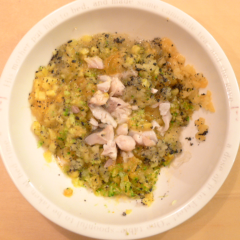 【夕ご飯】あじ7g 安納芋11g キャベツ5g ブロッコリー5g 南瓜5g 柿20g りんご20g 亜麻仁油1g 黒ごま1.5g ブルーベリー1g 小岩井10g 湯100cc ebi1T bio2/3g VC0.05g Ca0.2g Zn1/8T