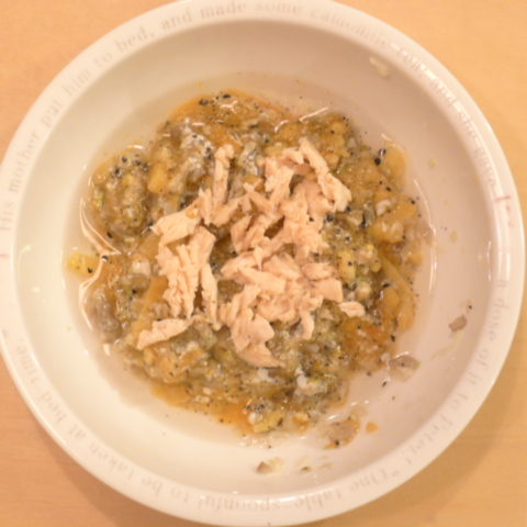 ぶり(熊本養殖)7g 納豆2.8g 安納芋12.5g キャベツ5g ブロッコリ6g 舞茸8g トマト30g 黒ごま2g ブルーベリー1g 小岩井10g ebi1T bio2/3g Ca0.2g Zn1/8T 湯60cc