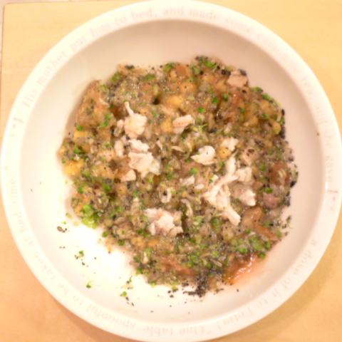 【夕ご飯】黒かれい7g 豆腐8.5g 安納芋10g キャベツ3.5g ブロッコリ3.5g トマト25g 舞茸3.5g 黒ごま2g 昆布0.2g ブルーベリー1g 小岩井10g ebi1T bio2/3g Ca0.2g Zn1/8T 湯60cc