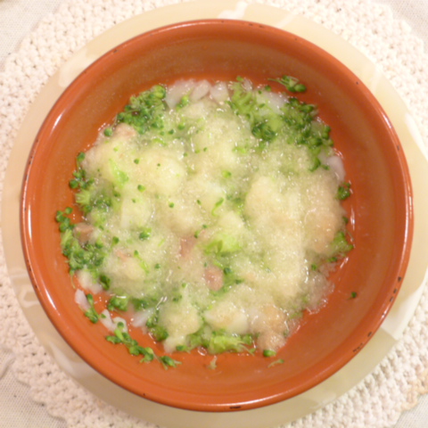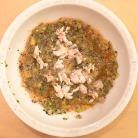 ぶり(天然)10g 納豆2.8g 安納芋15g キャベツ5g ブロッコリ 8g トマト40g 舞茸5g 昆布0.1g 黒ごま2g ブルーベリー2g 小岩井15g (食後に)豆腐5g ebi1T bio2/3g Ca0.2g Zn1/8T 湯60cc