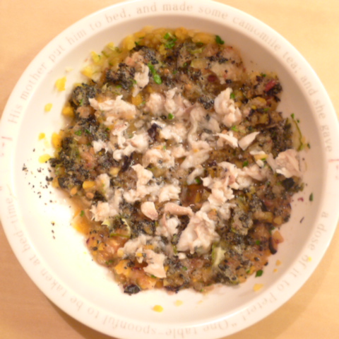 あじ10g 納豆2.8g 安納芋9g 南瓜8g きゃべつ5g ブロッコリ芽6g トマト20g りんご20g ブルーベリー6g 黒ごま3g 小岩井5g 湯50cc ebi1/2T bio0.8g Ca0.2g Zn1/10T