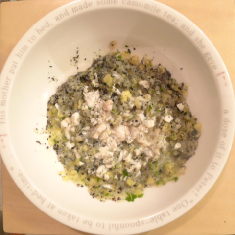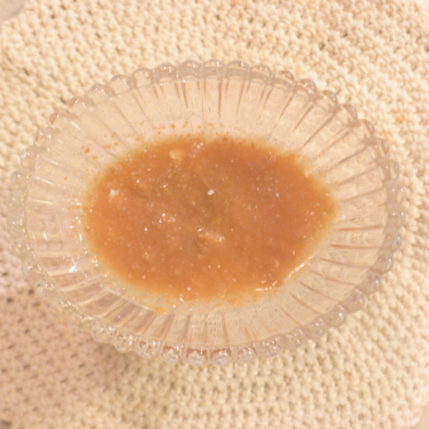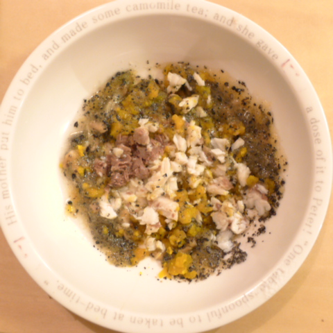 ぶり(熊本養殖)5g 豆腐10g 坂出金時10g キャベツ3g ブロッコリ芽2g りんご20g 黒ごま2g 小岩井5g 湯30cc