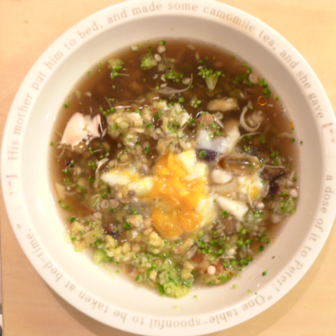 ささみ7g 納豆2.1g さつま芋10g ブルーベリー6g きゃべつ6g ブロッコリ芽6g りんご20g 昆布0.3g 亜麻仁油0.5g 湯80cc ebi1T bio2/3g VC0.2g のこぎりやし1cap γ-リノレン酸1/2cap