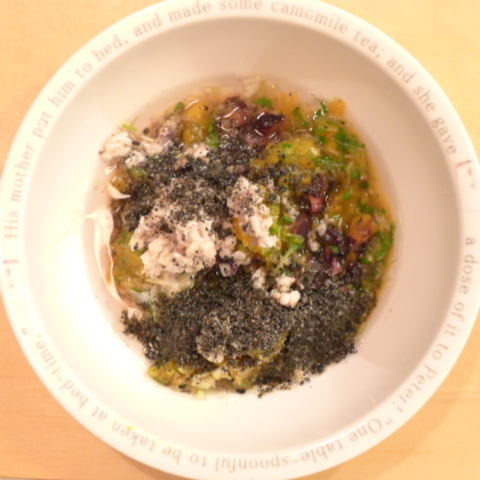 ぶり(熊本養殖)7.5g 南瓜15g ブルーベリー6g きゃべつ7g ブロッコリ芽7g 昆布0.2g 黒ごま2g 小岩井10g 湯60cc bio2/3g VC0.2g Ca0.2g