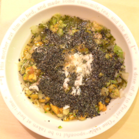 鮭7.5g さつま芋15g 南瓜8g ブルーベリー6g きゃべつ8g ブロッコリ芽3.5g ブロッコリ5g もやし5g トマト12g 昆布0.3g 黒ごま3g 小岩井10g 湯100cc ebi1T bio2/3g VC0.2g Ca0.2g