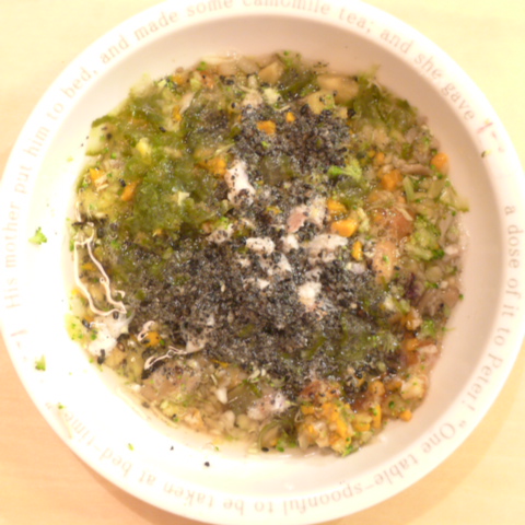 あじ7.5g 納豆2.1g さつま芋15g 南瓜5g ブルーベリー6g きゃべつ7g ブロッコリ6g もやし5g トマト12g 舞茸5g+舞茸出汁5g 昆布0.3g 黒ごま3g 小岩井10g 湯100cc ebi1T bio2/3g VC0.2g Ca0.2g Zn1/8T