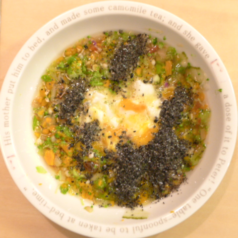 ぶり(高知養殖)7.5g 納豆2.1g ブルーベリー6g 南瓜10g きゃべつ5g ブロッコリ6g 小松菜3.5g おくら5g もやし5g トマト15g 舞茸出汁5g 昆布0.3g 黒ごま3g 湯 ebi1T bio2/3g VC0.2g Ca0.2g Zn1/8T (2~3割食べる)