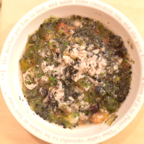 鰯7.5g 納豆2.1g さつま芋15g 南瓜5g ブルーベリー6g きゃべつ5g ブロッコリ芽5g おくら5g トマト25g 舞茸出汁5g 昆布0.3g 黒ごま3g 湯100cc ebi1T bio2/3g VC0.1mg Ca0.2g Zn1/8T