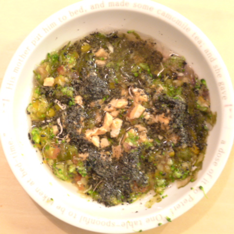 鮭7.5g さつま芋15g 南瓜5g ブルーベリー6g きゃべつ6g ブロッコリ5g おくら5g トマト20g 舞茸出汁5g 昆布0.3g 黒ごま2.5g 小岩井5g 湯100cc ebi1T bio2/3g VC0.1mg Ca0.2g zn1/8T