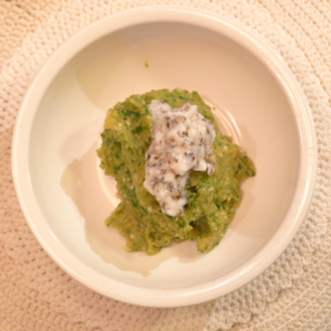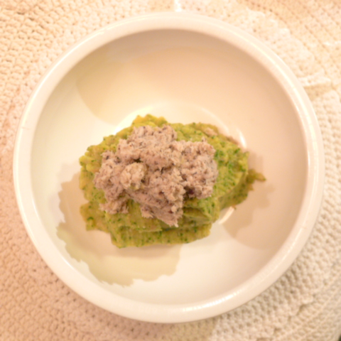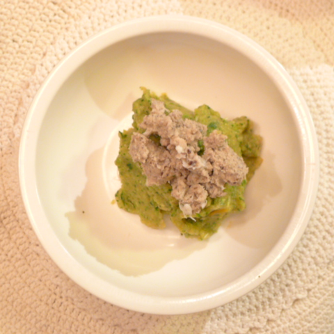 あじ(長崎)8.5g 黒豆納豆2.5g 芋15g 南瓜15g トマト30g 春きゃべつ6g ブロッコリ6g 小松菜5g スナップえんどう4g おくら6g ebi2T bio1.5g cil1g 小岩井3g あじの煮こごり amino0.3g 湯100g