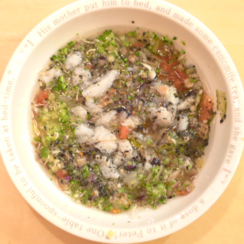 (おやつにりんご20g VC0.1g 湯20cc) 舌平目6.5g 納豆2.8g さつま芋15g ブルーベリー6g きゃべつ5g ブロッコリ5g アスパラガス5g おくら5g トマト18g 舞茸出汁3g 昆布0.3g 黒ごま2.5g 亜麻仁油0.2g 湯100cc ebi1T bio2/3g Ca0.2g のこぎりやし1cap