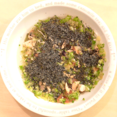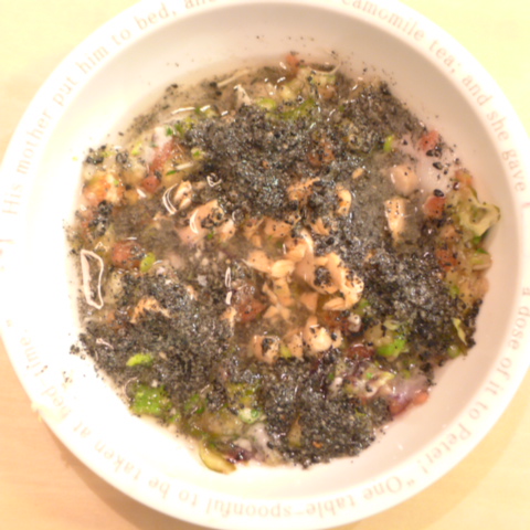 鮭7.5g 納豆2.1g さつま芋15g ブルーベリー6g きゃべつ5g ブロッコリ6g アスパラガス5g おくら5g トマト15g 舞茸出汁8g 昆布0.5g 小岩井10g 湯100ccebi1T bio2/3g VC0.2g Ca0.2g Zn1/8T