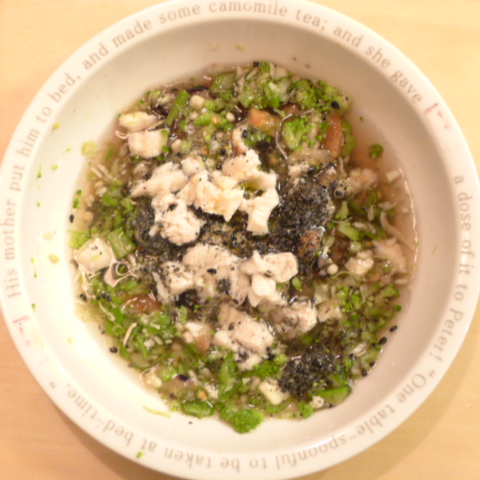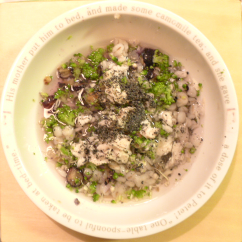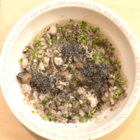 (食前にりんご20g + 湯20cc +VC0.1g ) ささみ7g 納豆2.1g 押麦12g ブルーベリー6g きゃべつ5g ブロッコリ5g もやし5g おくら6g 黒ごま1.5g 小岩井5g 湯 bio2/3g VC0.1g Ca0.2g