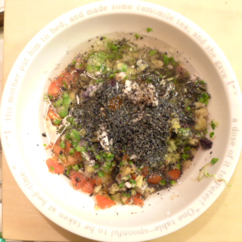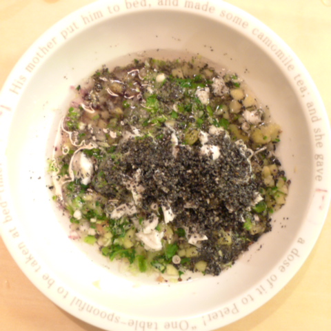 ぶり8g 納豆2.8g さつま芋20g ブルーベリー10g りんご15g きゃべつ6g ブロッコリ芽3.5g おくら6g マッシュ茸6g 昆布0.1g 小岩井10g 黒ごま3g 湯90cc ebi1T bio2/3g Ca0.2g のこぎりやし1cap