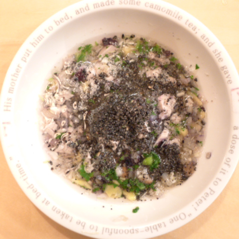 鮭7g 納豆2.1g さつま芋15g ブルーベリー6g きゃべつ5g ブロッコリ4g もやし5g 小松菜5g おくら5g 昆布0.1g 黒ごま3g 小岩井10g 湯130cc bio2/3g VC0.2g Ca0.2g のこぎりやし1cap
